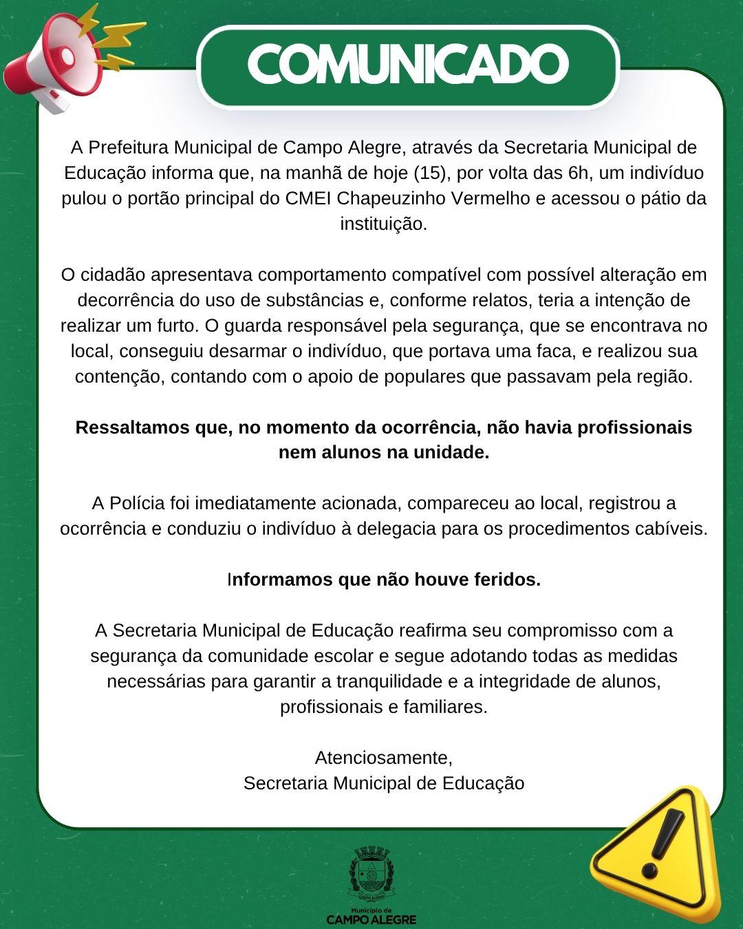 A Polícia Militar prendeu, na manhã desta quarta-feira (15), um homem de 26 anos que invadiu um Centro Municipal de Educação Infantil (CMEI) em Bateias de Baixo, Município de Campo Alegre, com a intenção de cometer um furto. A ocorrência foi registrada por volta das 6h.
