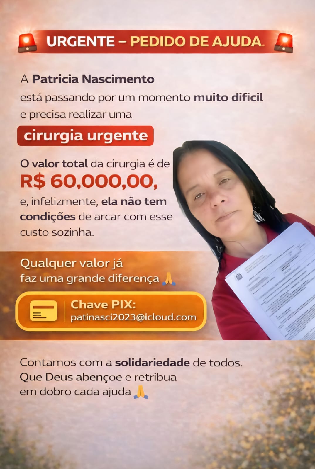 Uma campanha solidária tem mobilizado amigos, familiares e a comunidade em prol de **Patrícia do Nascimento**, que enfrenta uma grave condição de saúde e precisa com urgência de uma cirurgia de alta complexidade.
