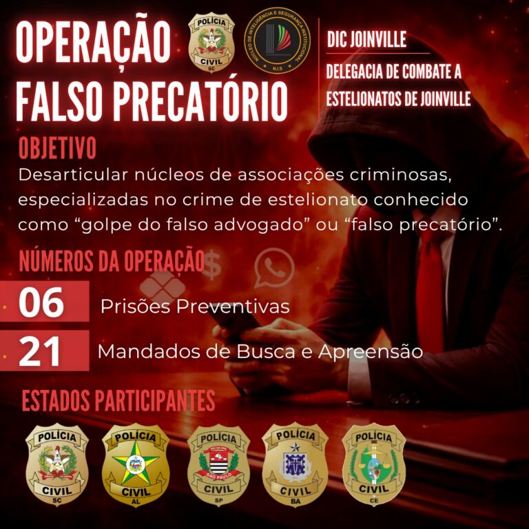 A Polícia Civil de Santa Catarina, por intermédio da Delegacia de Combate a Estelionatos (DCE) do Departamento de Investigações Criminais de Joinville, em atuação conjunta com o Núcleo de Inteligência e Segurança do Tribunal de Justiça de Santa Catarina (NIS/TJSC), deflagrou nesta data (24/03) a operação “Falso Precatório”.